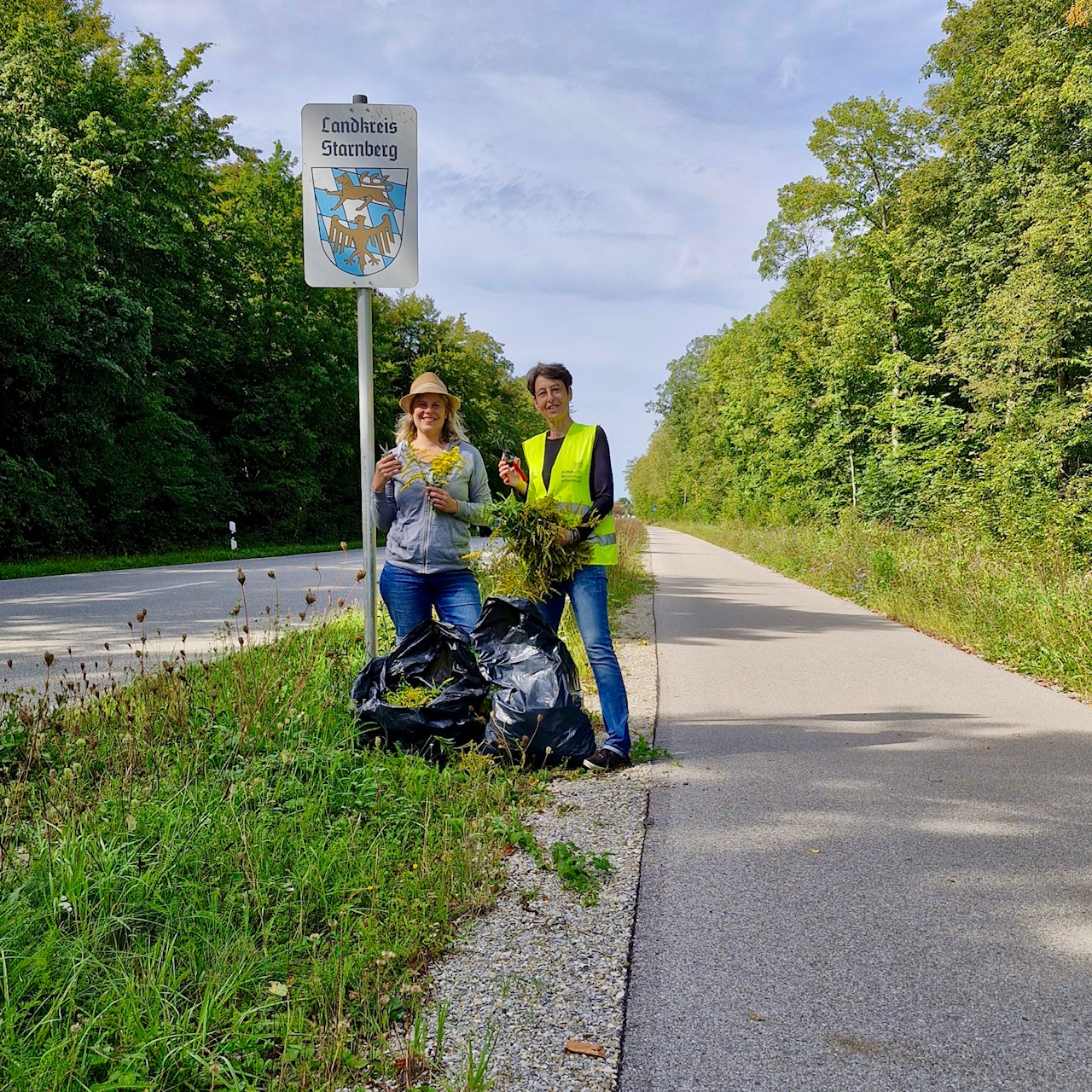 Die heimische Flora braucht Hilfe, denn Eindringlinge verdrängen zusehends unsere Pflanzen. zumindest die Münchenerstraße von Gauting nach Neuried bis zum Wechsel Landkreis Starnberg/ Landkreis München. Zugegebenermaßen ist es nur ca 1km, auf dem die kanadische Goldrute (Solidago canadensis) und das Berufskraut (Erigeron annuus) ihre Köpfe bzw. Samenstände lassen mussten.Ehrenamtliche vom Bund Naturschutz „Team Gauting“ und